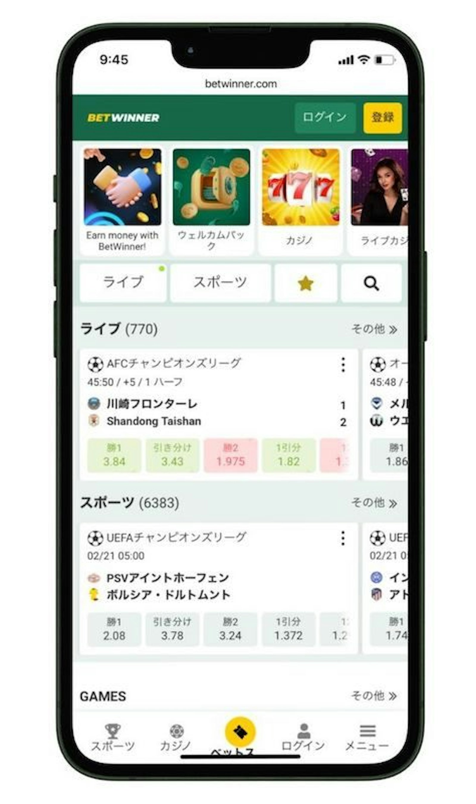- ゲームの種類:スポーツベット、ライブベット、カジノ、ライブカジノ
