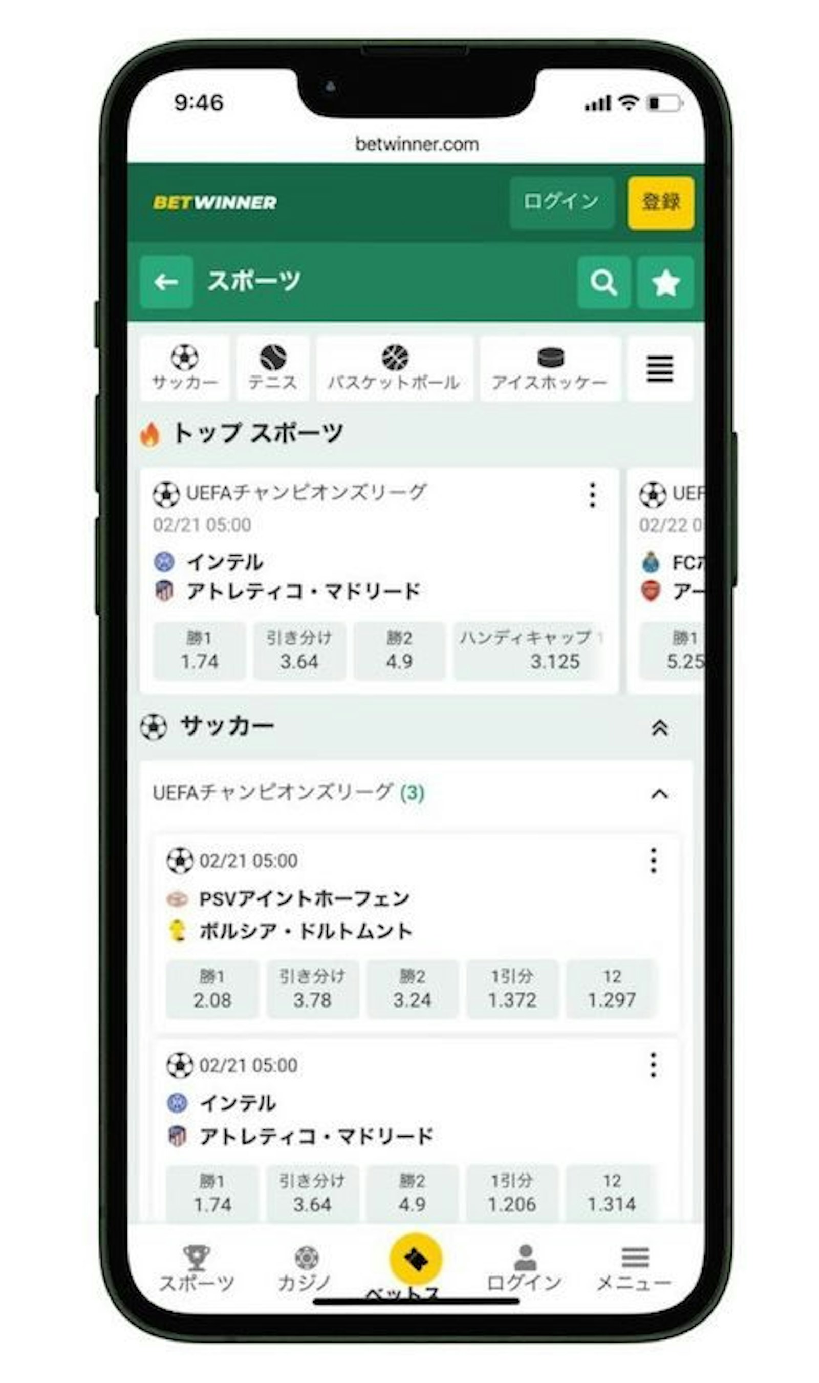 また、各イベントにはオッズと賭け方の選択肢が並列されるので、賭けたい選手、ダブルチャンス、オーバー/アンダー、ハンディキャップなどを手早く選択できます。ベテランベッターにとって、Betwinnerのオッズとベッティングの選択肢の配置は非常に便利です。