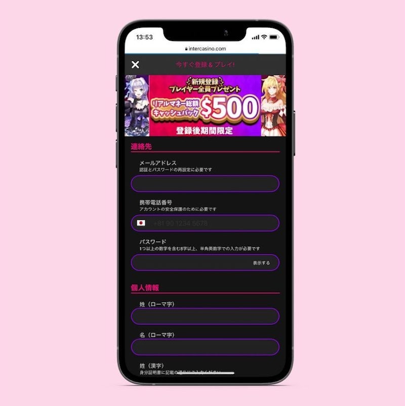 インターカジノのウェルカムボーナスの内容がわかったところで、ボーナスの獲得に必要になるログイン、および登録方法をみていきましょう。インターカジノへログインするには登録が必須となります。