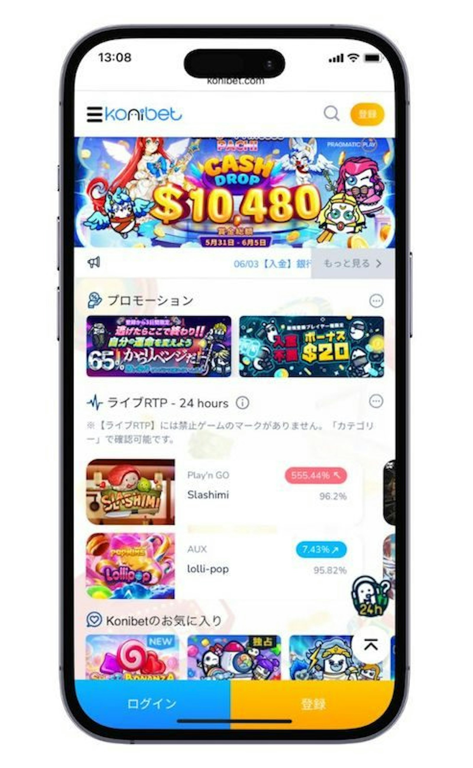 コニベットでは、登録するだけでもらえるスロット用入金不要ボーナスと、負けても安心の初回入金リベンジボーナスの二本立てです。